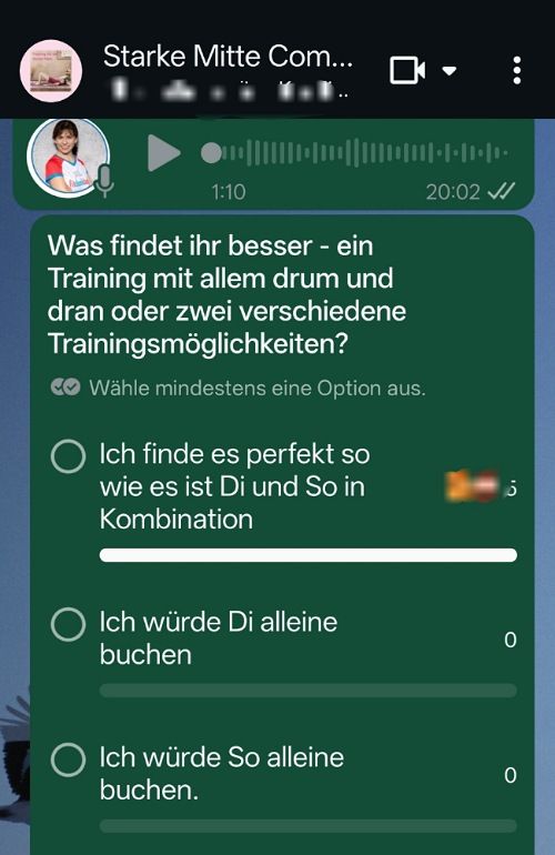 Ein Screenshot aus der begleitenden WhatsApp-Gruppe von meiner Embodied Core Flow Live Membership – dem Online-Training für eine starke Mitte. Ich habe schon letztes Jahr überlegt, ob ich das Angebot aufteilen und die kurzen, fortgeschrittenen Einheiten von den längeren Basic-Einheiten trenne.