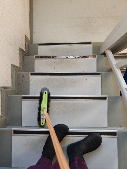 Bevor ich mich wieder an den Schreibtisch setze, kehre ich noch das Treppenhaus. Ich muss die Gunst der Stunde nutzen, denn es ist noch hell UND ich habe gerade keinen wichtigen Termin.